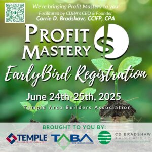 Carrie D. Bradshaw, CPA, CCFIP, CEO and Founder of CD Bradshaw & Associates, facilitates Profit Mastery, the nation’s only in-person workshop of its kind. She is on a mission to transforming the way businesses make financial decisions by equipping them with practical tools to navigate challenges and seize opportunities with ease.